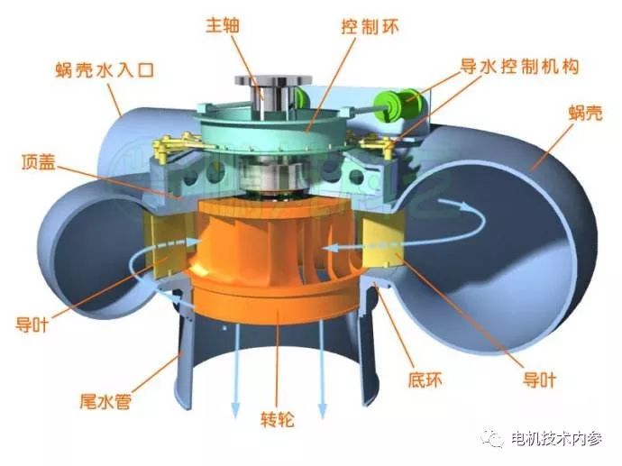 水輪發(fā)電機(jī)之結(jié)構(gòu)及安裝方法決定于水輪機(jī)之型式。根據(jù)水力資源開(kāi)發(fā)的情況,水輪機(jī)選用三種型式之一:沖擊式、軸流輻流式或旋漿式。種用于高水頭設(shè)備,第二種用于中等水頭,而旋漿式用于利用的水流對(duì)水平面落差小的情況。